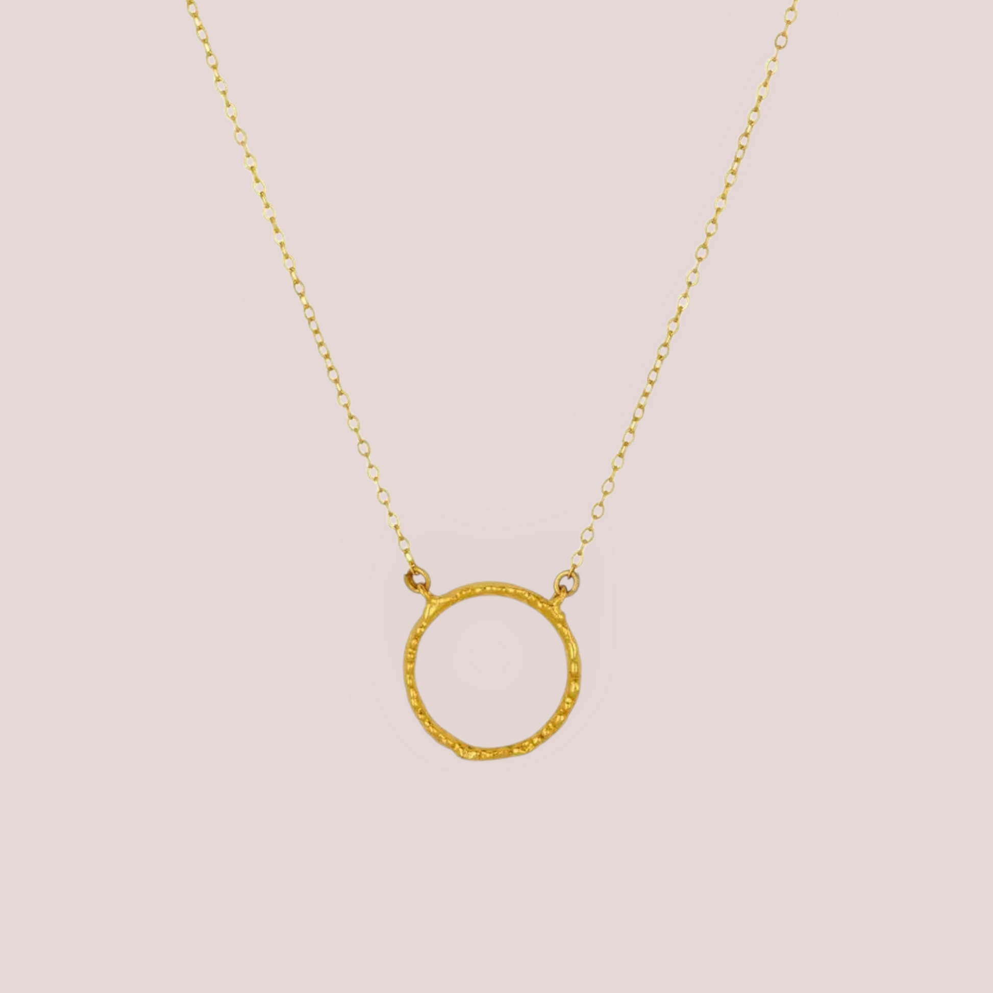 Add a touch of charm to your everyday look with the Chelsea Gold Ring Pendant Necklace. Featuring a textured delicate gold ring pendant on a thick gold chain, this short necklace is perfect for layering or wearing solo. Its playful design brings effortless style to any outfit, making it your new go-to accessory.