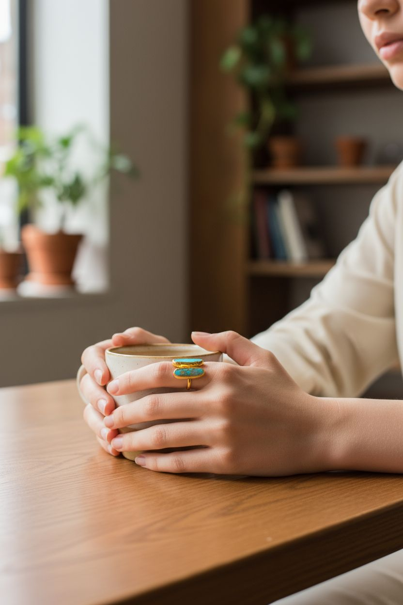 Make a bold, earthy statement with the Laguna Ring. Featuring two elongated, natural green turquoise stones set in a gleaming 18k gold-plated band, this adjustable ring blends organic charm with modern elegance. Each stone is uniquely marbled, ensuring no two pieces are alike. Perfect for stacking or standing solo, it adds a touch of artisan sophistication to any look.