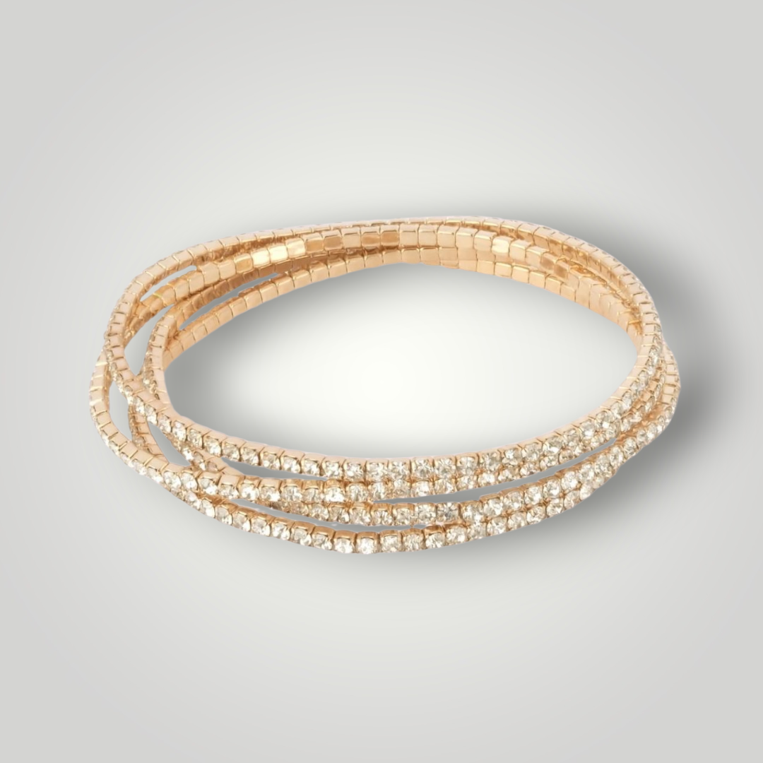 Elevate your accessory collection with this gold tennis bracelet set, featuring four elasticated bracelets adorned with shimmering cubic zirconia crystals. Designed for effortless wear, these bracelets combine flexibility with sparkle, making them perfect for layering or wearing individually.