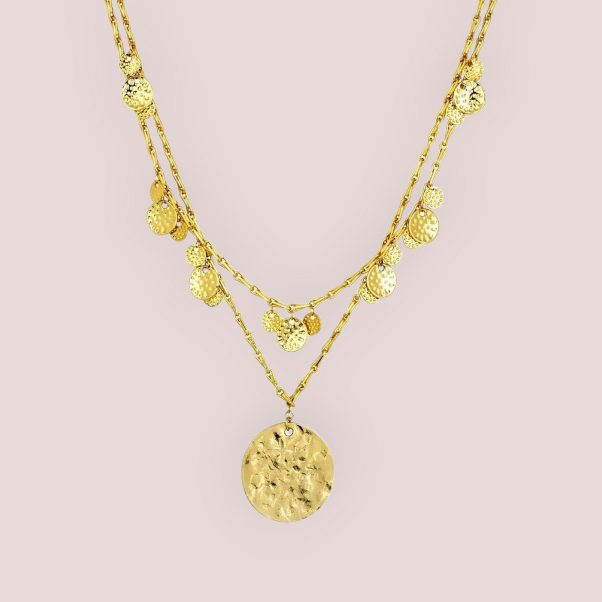 Double-layered long necklace with signature gold textured coins. This double-row Penelope necklace features a disc pendant and mini discs along the chain all hand-textured by artisan makers. A bold finishing touch for any outfit.