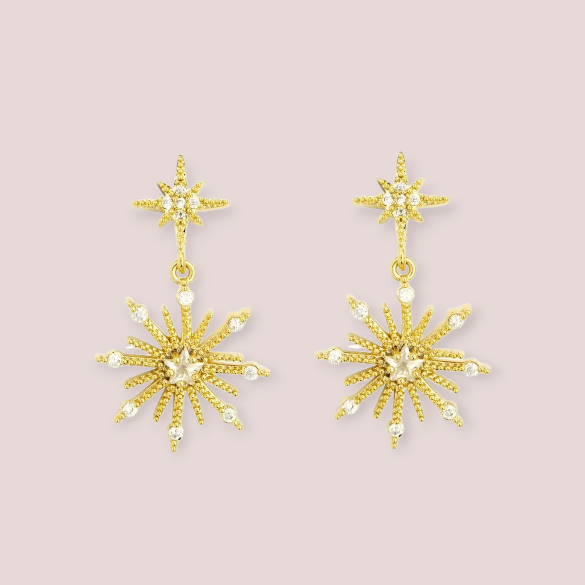 Delicate cubic zirconia and star stud earrings The Northern star earring features an intricately ornate star stud with cubic zirconia. Hanging underneath is another intricate star that swings elegantly. This earring is so fine and lightweight that it is easy to wear all day and night. The patterns on the gold are highlighted with a delicate dusting of cubic zirconia to complete the look.