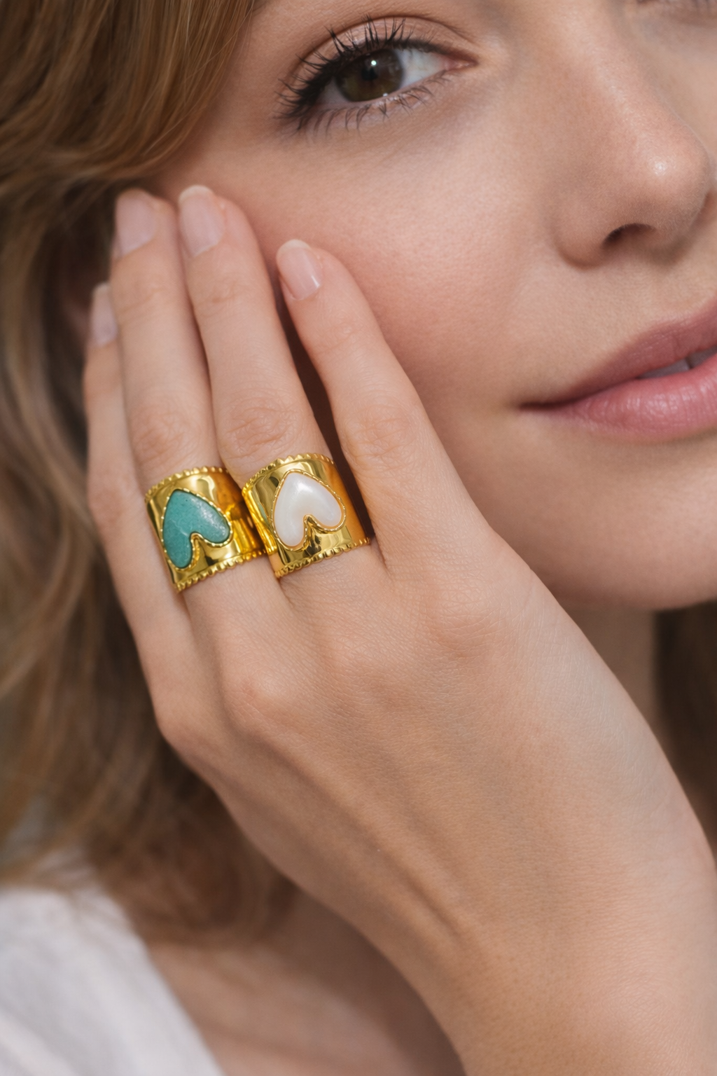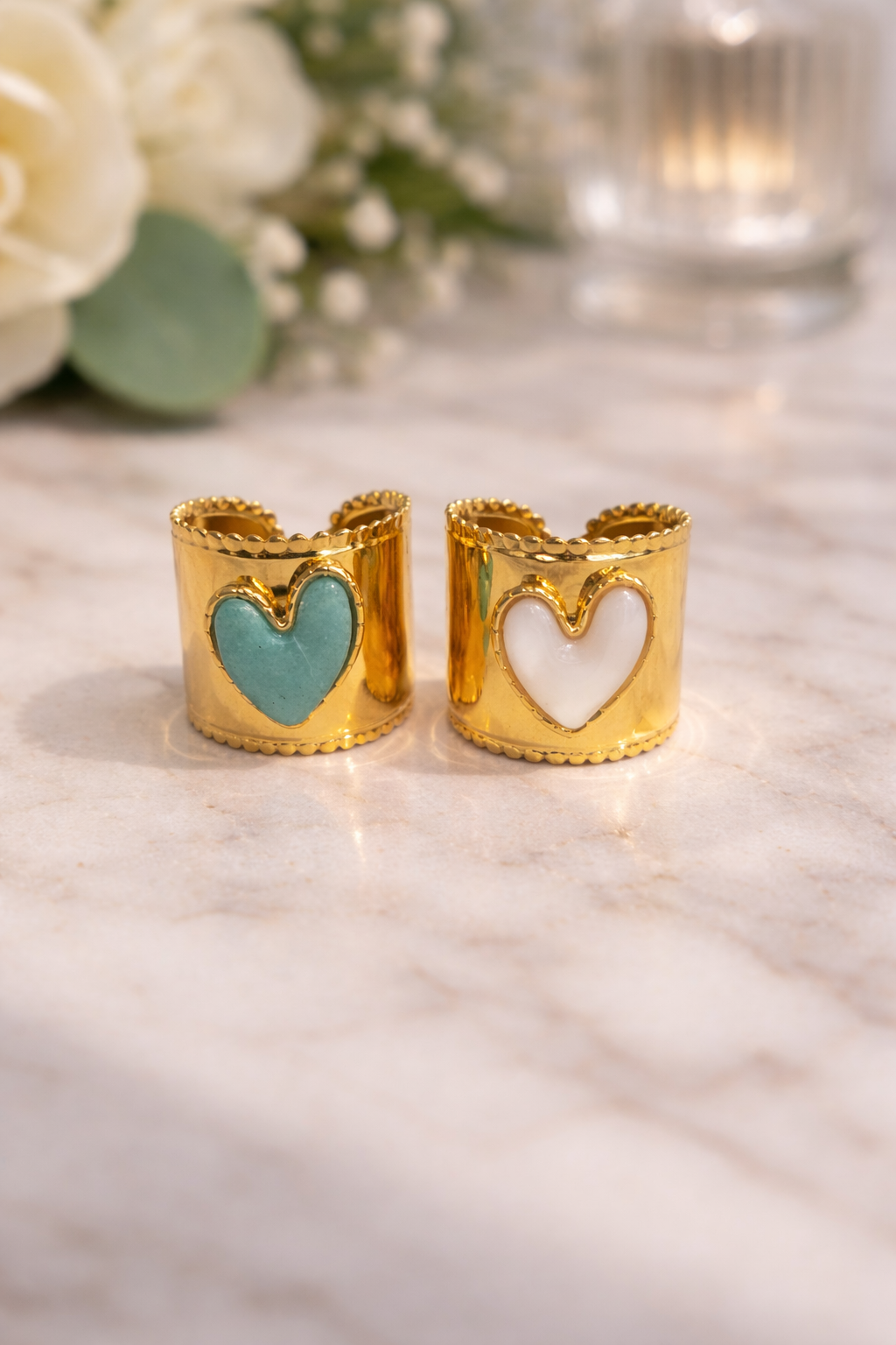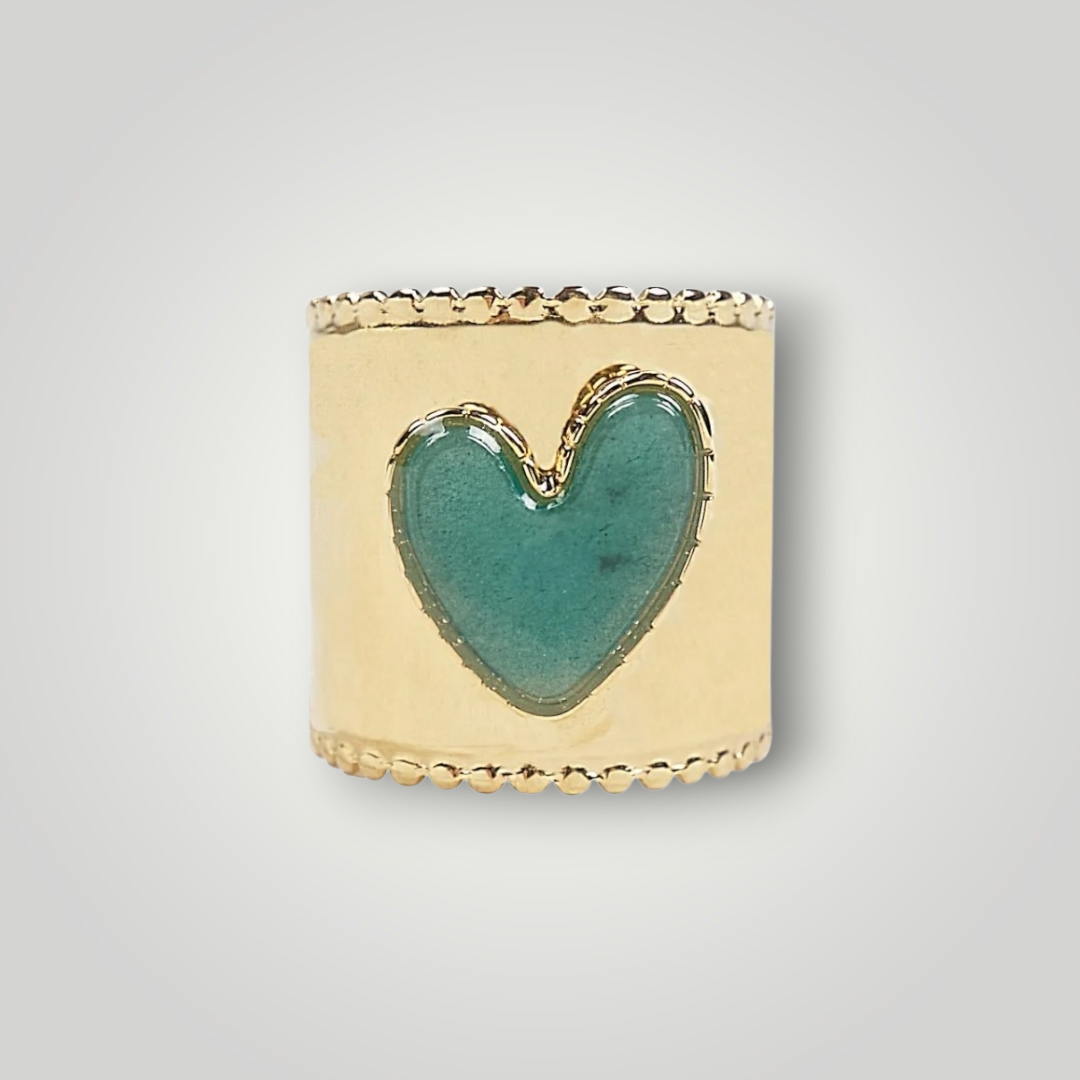 Crafted in durable stainless steel with a rich gold-plated finish, this bold statement ring features a sculptural heart detail available in two beautiful stones: soft green Amazonite and luminous Mother of Pearl.