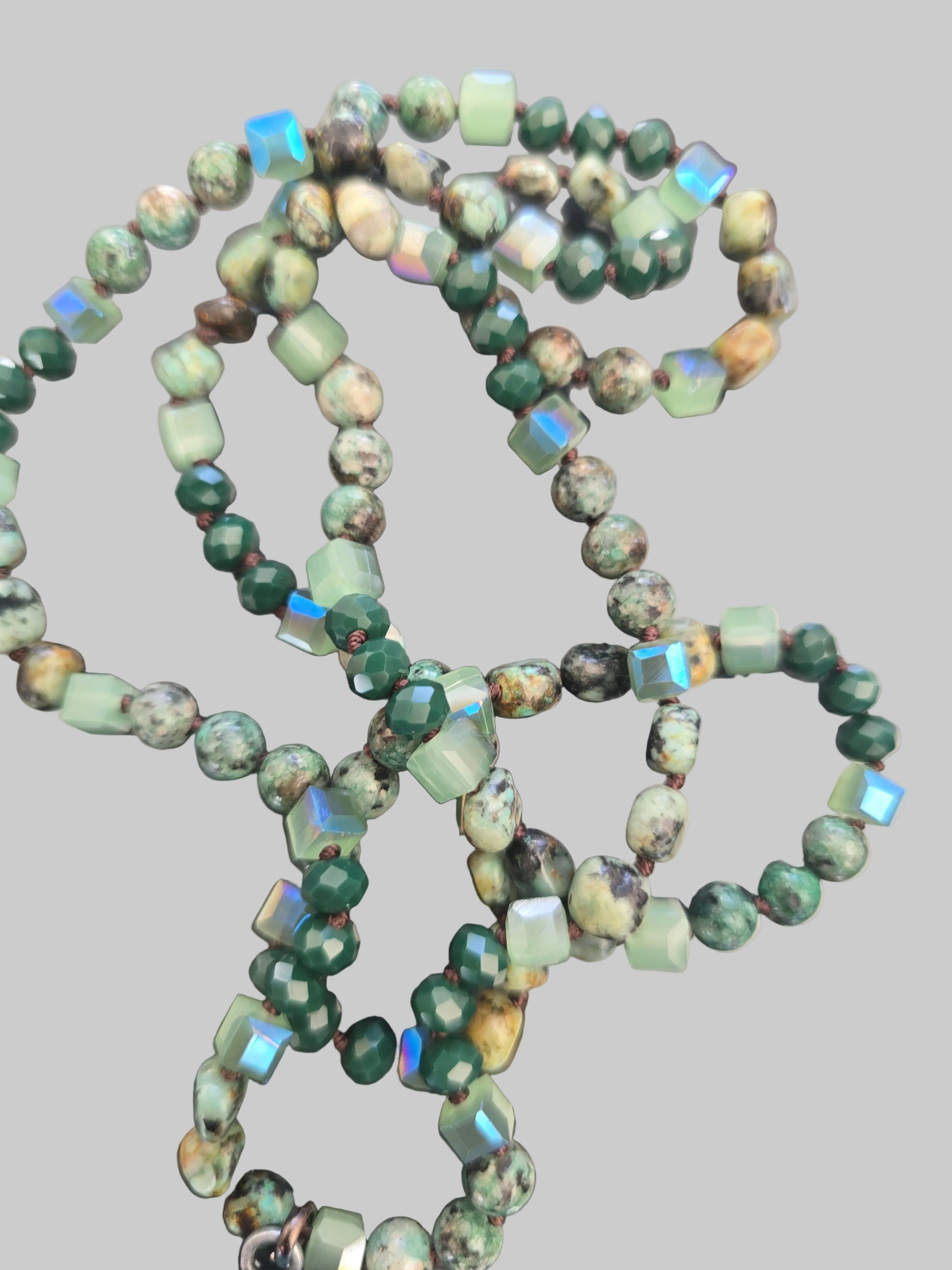 This one-of-a-kind piece combines natural jasper-style stones with shimmering faceted glass accents, creating a necklace that feels both timeless and effortlessly bohemian.