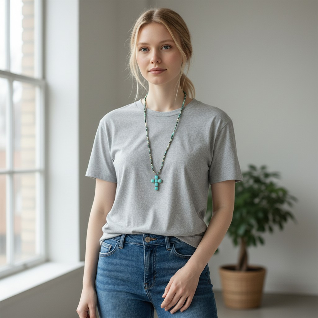 The antique silver-tone cross pendant is set with polished turquoise-look stones, offering a bold pop of colour and vintage character.